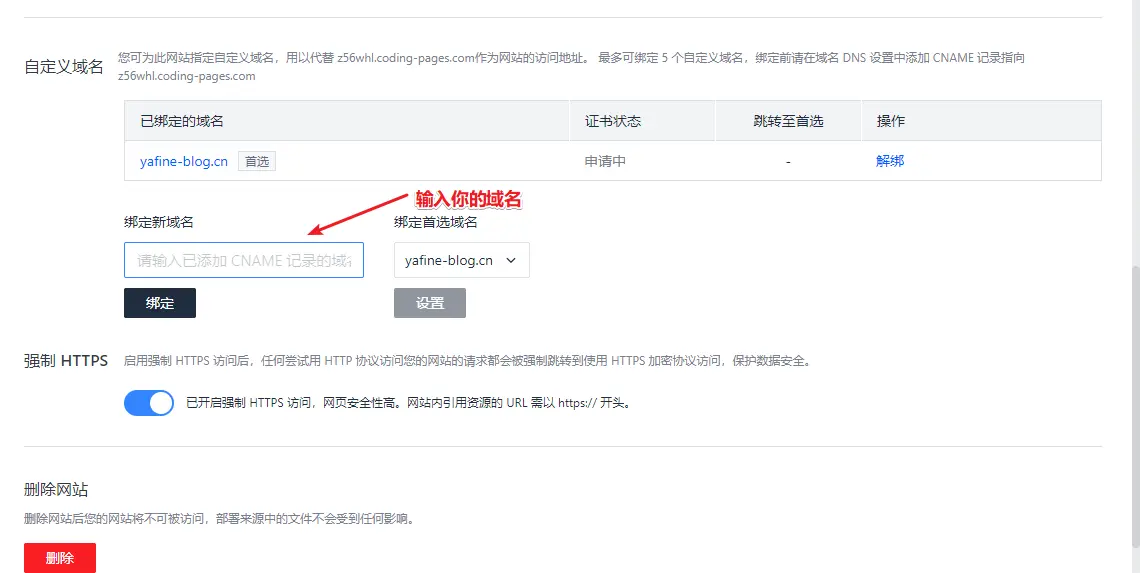 在绑定新域名下的输入框,输入你的域名,然后点击绑定即可。