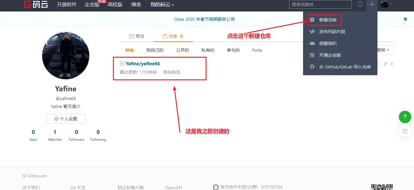 - 开始新建仓库,如上一张图的操作步骤,会出现如下效果: