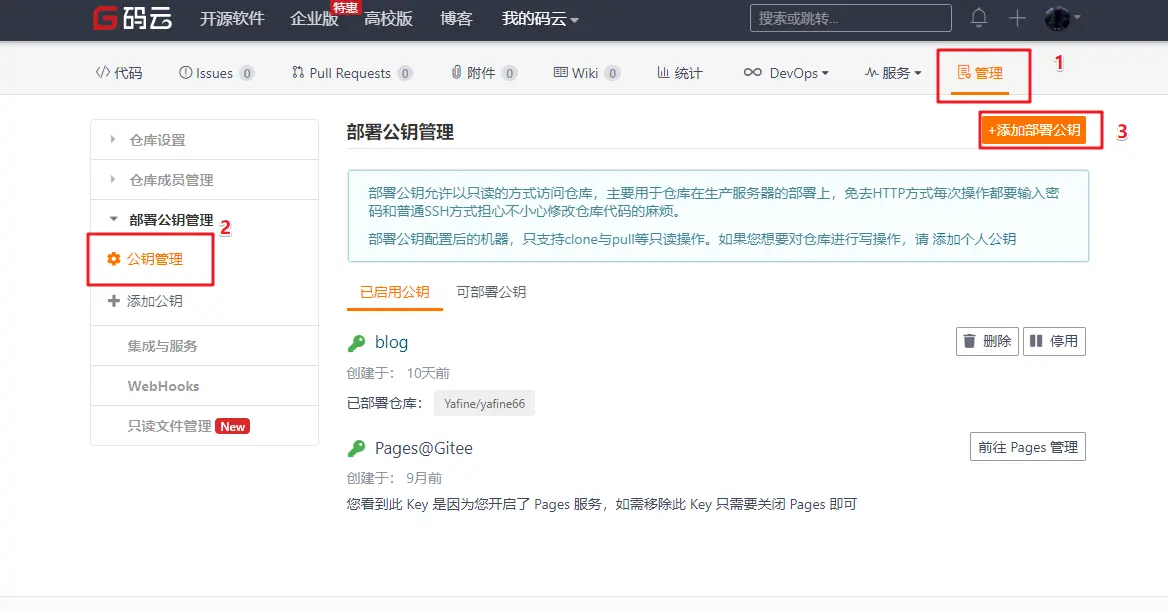 点击管理—>部署公钥管理—>新增部署公钥,添加公钥的内容也是之前部署到GitHub上添加的公钥