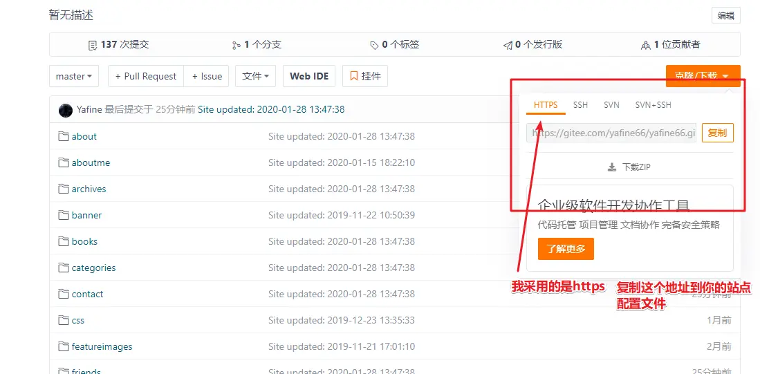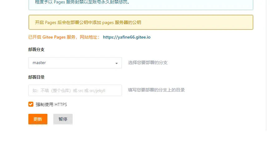 第一次设置Gitee Pages的效果不是我图中所显示的,最后的设置效果就是这样的,当显示图中红色文字已开启Gitee PAges服务,网站地址为:yafine66.gitee.io即部署成功,点击网址,查看效果。