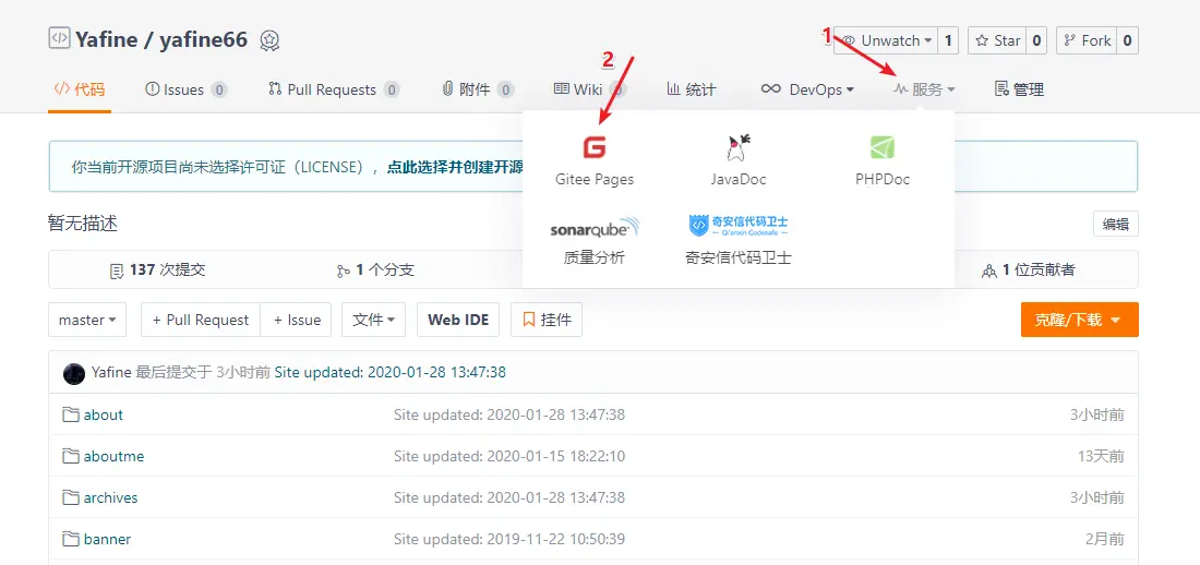 然后执行hexo clean && hexo g -d,部署成功后,点击服务—>Gitee Pages,进入下面的页面: