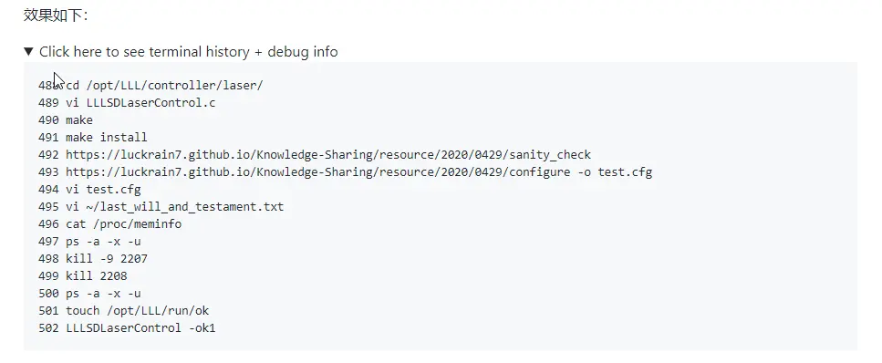 <details> <summary>Click here to see terminal history + debug info</summary> <pre> 488 cd /opt/LLL/controller/laser/ 489 vi LLLSDLaserControl.c 490 make 491 make install 492 luckrain7.github.io/Knowledge-S… 493 luckrain7.github.io/Knowledge-S… -o test.cfg 494 vi test.cfg 495 vi ~/last_will_and_testament.txt 496 cat /proc/meminfo 497 ps -a -x -u 498 kill -9 2207 499 kill 2208 500 ps -a -x -u 501 touch /opt/LLL/run/ok 502 LLLSDLaserControl -ok1 </pre> <details>