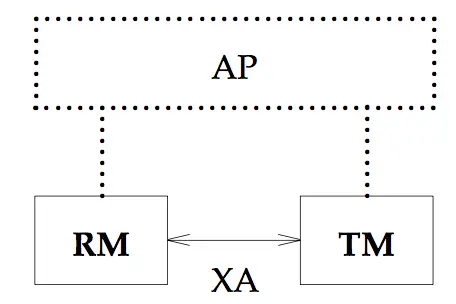 那什么是 XA 协议呢?XA 规范是定义交互接口,从上面的图中可以看出,整个 DTP 中,有三个交互接口,XA 规范主要是 TM 和 RMs 之间。下面这张图好理解一些:
