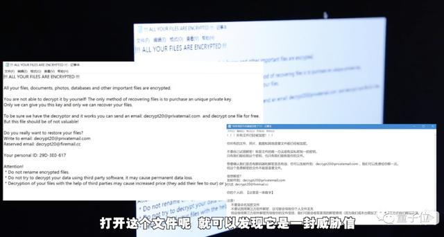 黑客给被攻击者留下了一串ID,需要给两个特定的邮箱发邮件联系,并通过这串ID来表明身份,与黑客谈判才能解开文件。