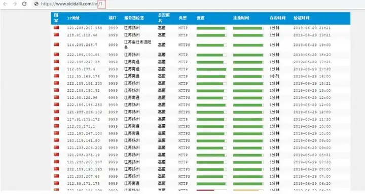 简单分析下页面,其中后面的 1 是页码的意思,分析后发现每一页有100 多条数据,然后网站底部总共有 2700+页 的链接,所以总共ip 代理加起来超过 27 万条数据,但是后面的数据大部分都是很多年前的数据了,比如 2012 年,大概就前 5000 多条是最近一个月的,所以决定爬取前面100 页。通 过网站 url 分析,可以知道这 100 页的 url 为: