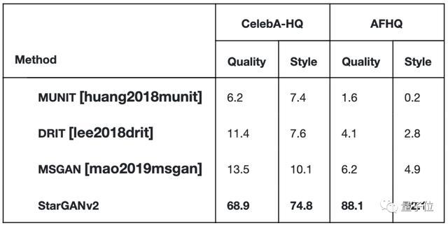 他们还把四种模型生成的图像上传到AMT平台,交给人工评选,绝大部分测试者都认为StarGANv2生成的图片更优质。
