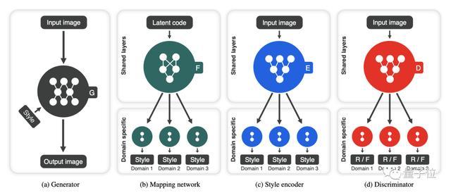 - 鉴别器从多个域中区分真实图像和虚假图像。