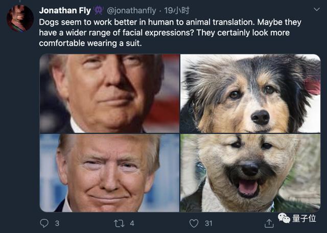 两者本来是“井水不犯河水”,但是有人偏偏要混用,拿特朗普的脸输入到动物脸预训练模型里。结果川普的脸转换成猫就成了这样: