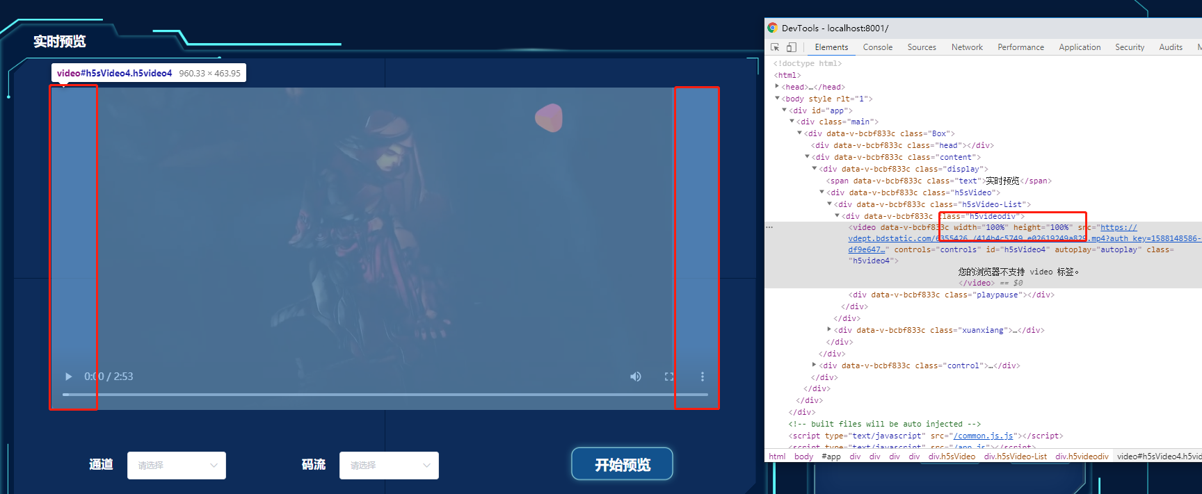 怎样让video充满父级元素 Not_Defined 2020-04-29 392 阅读1分钟 上图中我在video的标签中设置了百分百的宽高让它充满父级元素,但是可以看到在设置了之后video本身会出现无法填满的情况, 这个问题的解决方法是在video的属性上加上object-fit: fill; 属性即可, 本文章仅以自己防止忘记而记录,不管是我还是其他人,当你看到这篇文章的时候说明你还在从事前端工作,或者在学习前端,所以不管以后遇到什么问题,和挫折,都不要忘记你敲代码的初衷