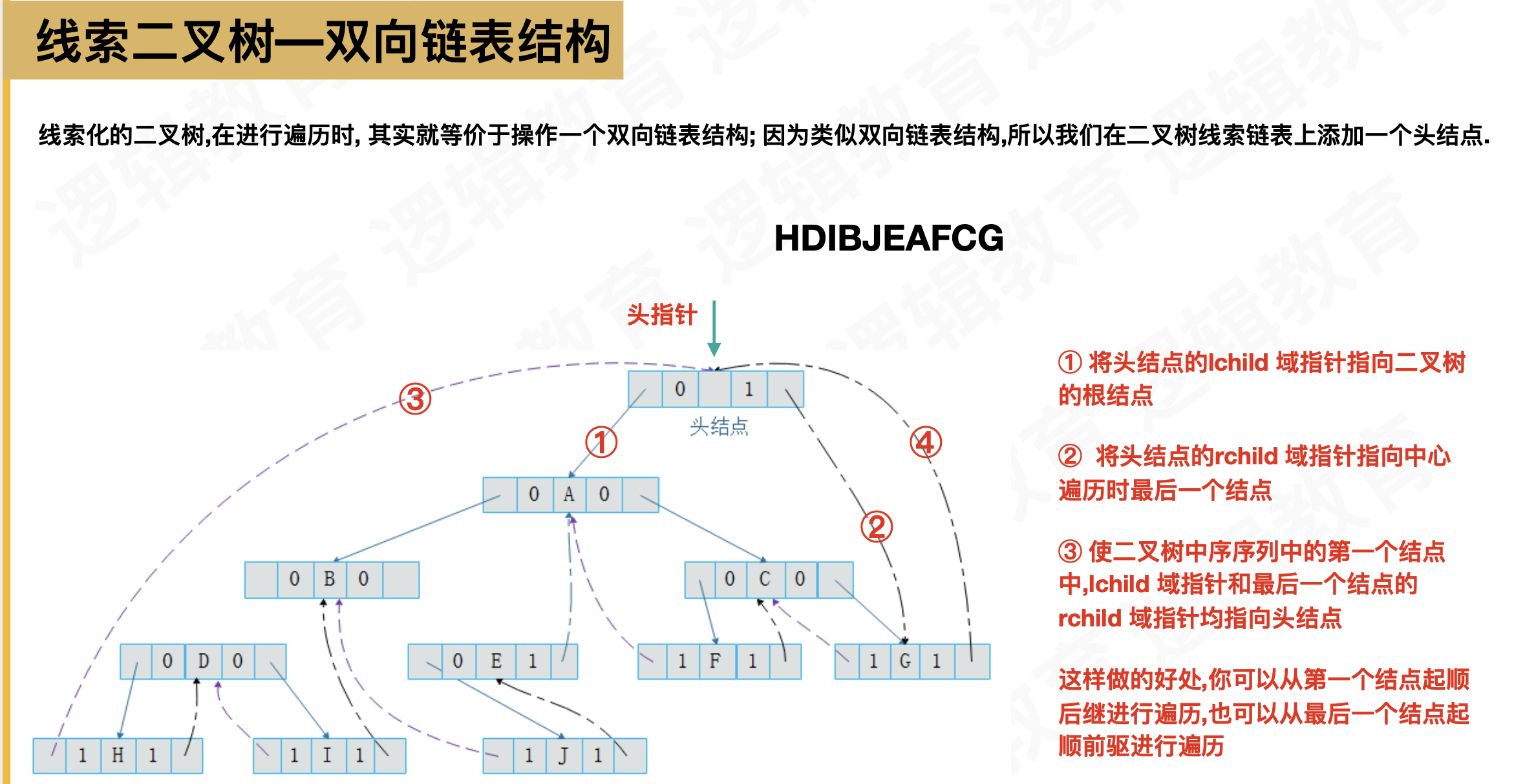 - 所有的前驱和后继必须按照某一种逻辑遍历(如中序遍历)