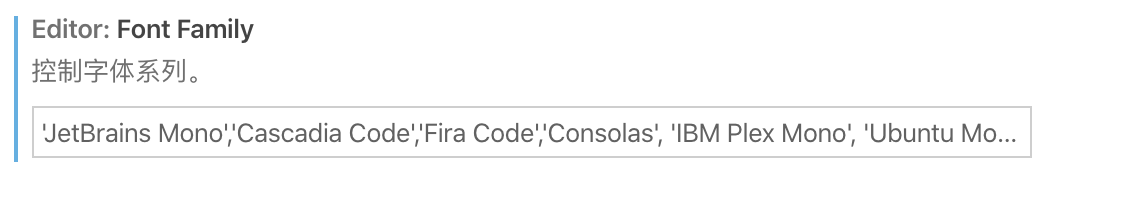"editor.fontFamily": "'JetBrains Mono','Cascadia Code','Fira Code','Consolas', 'IBM Plex Mono', 'Ubuntu Mono', 'monospace', monospace",