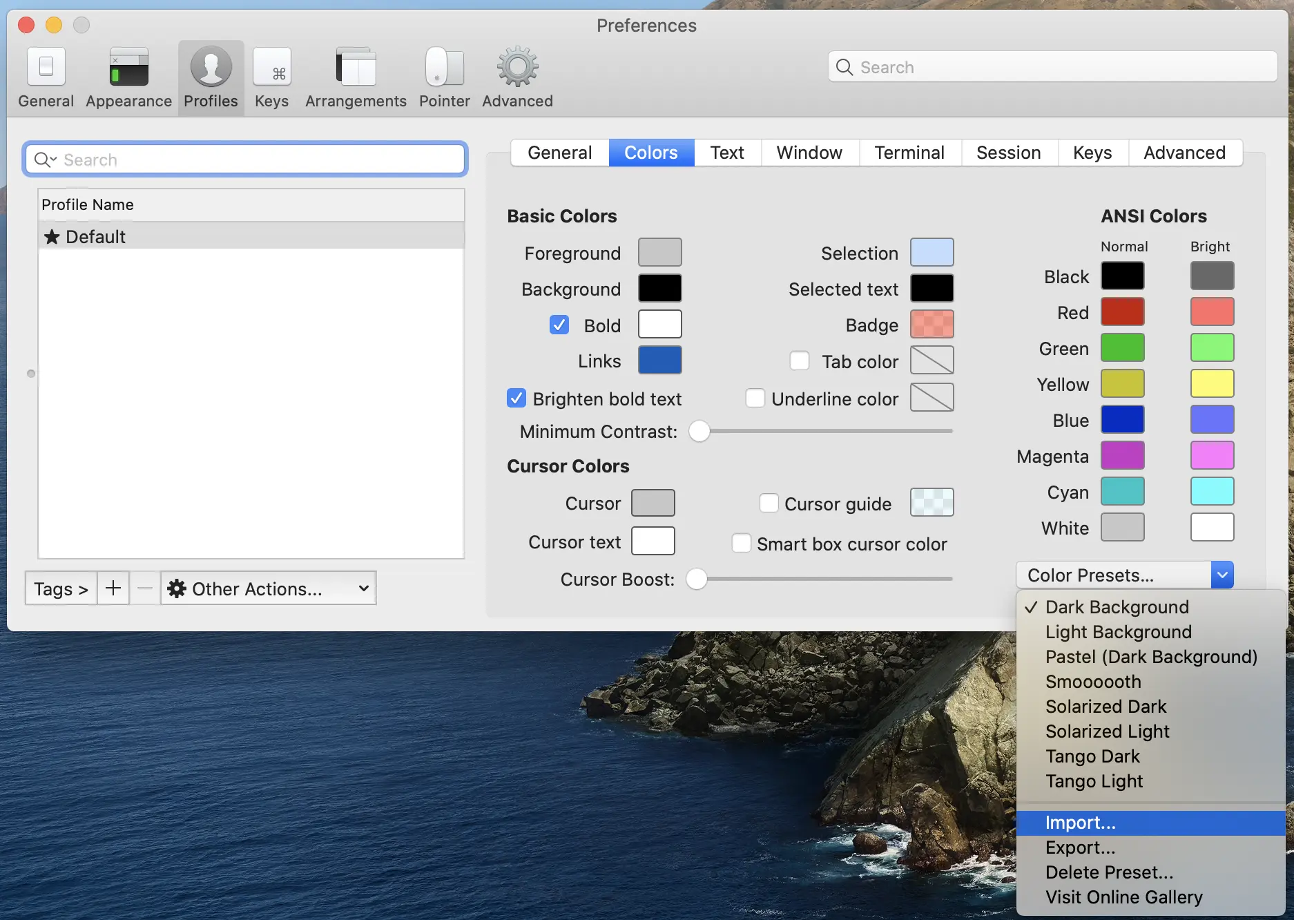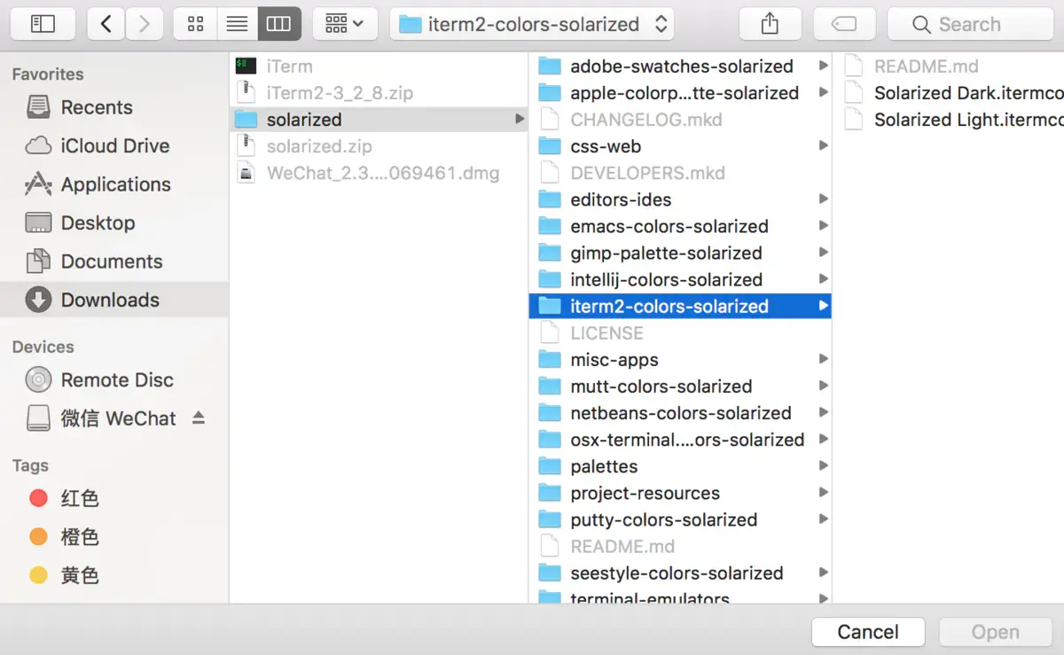 下载之后打开iTerm2, 按command+, , 打开Preferences界面, 点下profiles选择colors选项然后点击右下角的 Color Presets 选项,选择import 之后导入解压到的 solarized 文件下的Solarized Dark.itermcolors
