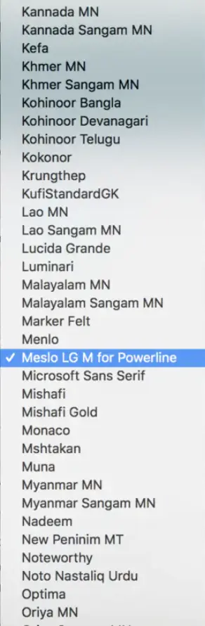 下载安装成功之后, 按commond+, 打开Preferences页面 Profiles->Text->Font->Chanage Font 选择 Meslo LG M Regular for Powerline 字体.