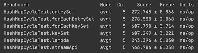 其中 Score 列表示平均执行时间, ± 符号表示误差。从以上结果可以看出,lambda 表达式和两个 entrySet 的性能相近,并且执行速度最快,接下来是 stream ,然后是两个 keySet。