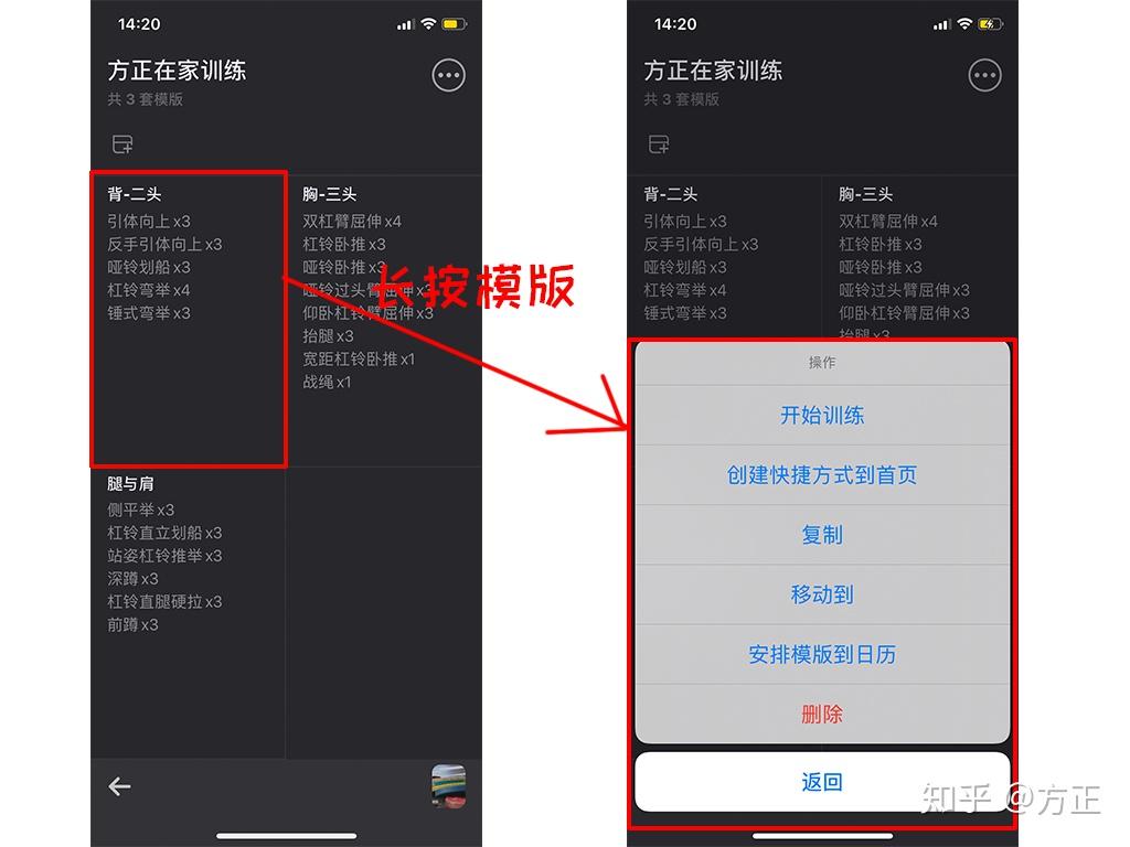 因此训记提供了「计划模版」功能,他能够让你提前定制你的计划,并安排到规定的日期,这样你就不用每次都重新添加组数、次数、动作这些麻烦的操作了。