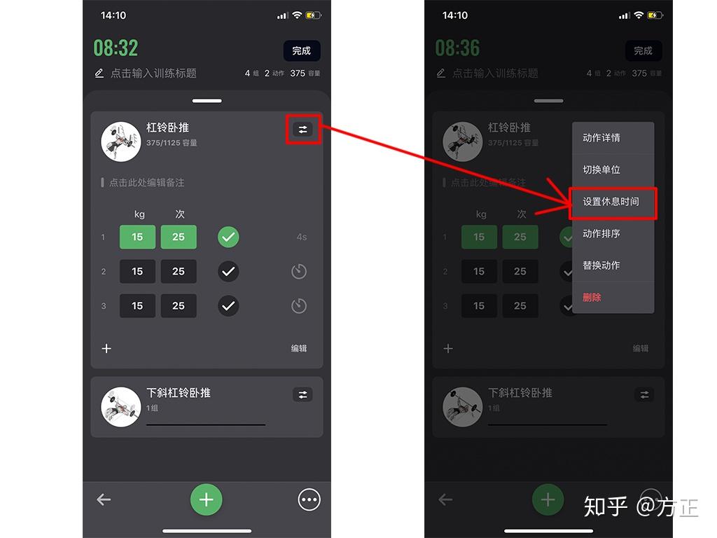 同时你可以在每个动作右上角的菜单中,设置这个组间间歇时间。