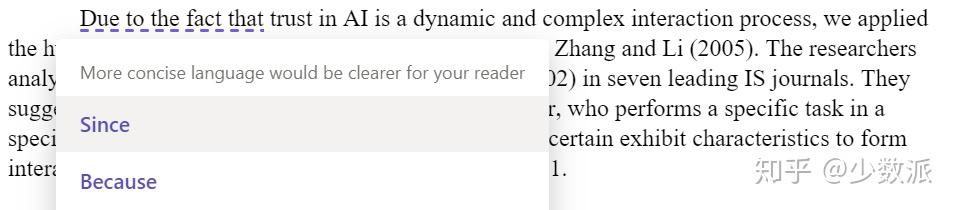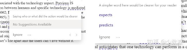 对于文章清晰度 (Clarity), Grammarly 提供 16 处修改意见,Microsoft Editor 指出 27 处。Grammarly 提供的修改意见中,有 9 处被动语态提示 (被动语态并不应完全禁止),其他提示诸如指代词不清 (Unclear antecedent)、删除重复词汇 (Tauotology) 以及复杂句型简单化 (Rewrite hard-to-read) 都可以算作有效修改。清晰度有效提示率至少大于 7/11=64%。