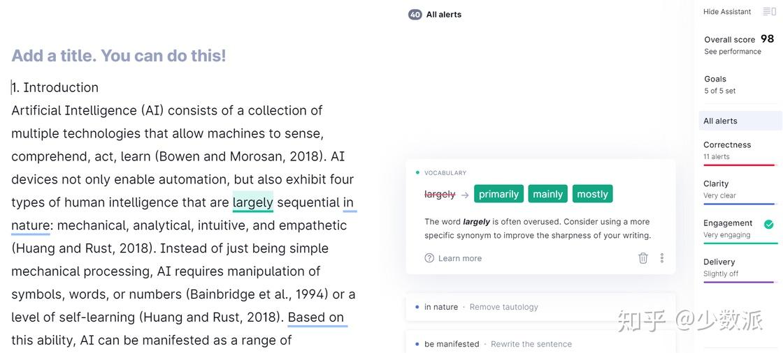 例如,我在写少数派这类文章时,可以设定我的写作目标是以非正式的语气为知识渊博的读者写一些关于技术主题的东西。然后,Grammarly 将不断分析我的写作,并就如何调整从词汇到标点到句子长度的所有内容提出建议,以实现我的写作目标。