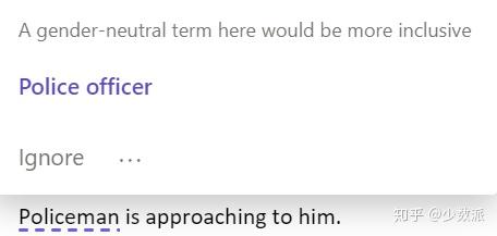 Microsoft Editor 同样对文笔风格(包括清晰度,简洁性,形式性和包容性等)进行润色和修正。比如包容性,它会提示作者使用更中性普遍的词汇来代替具有偏见的文本(policeman ->police officer)。