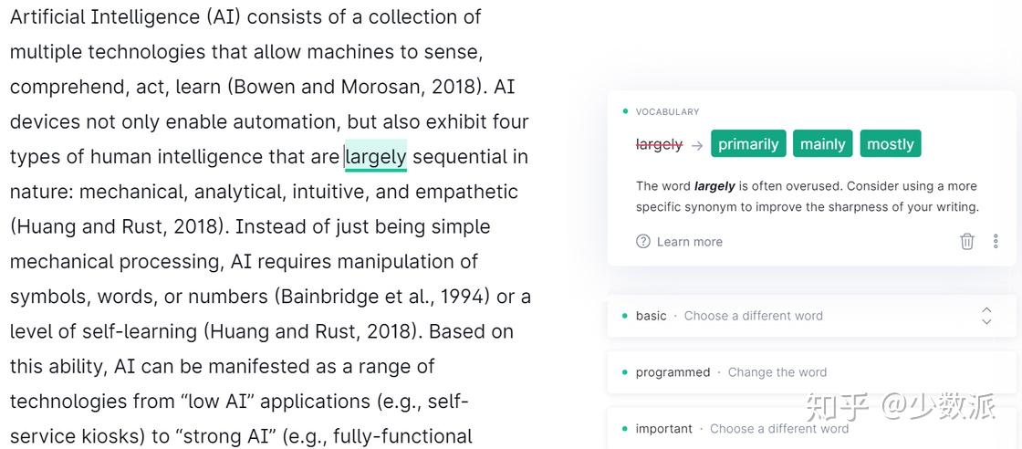 Grammarly 还提供对于专业写作来说更有针对性的辅助功能,诸如词汇加强 (Vocabulary)、被动语态选择 (Passive voice)、行文流畅 (Fluency)、分解难读句型 (Split hard-to-read sentences) 以及学术写作中的人称代词选择 (Personal pronoun in academic writing) 等。