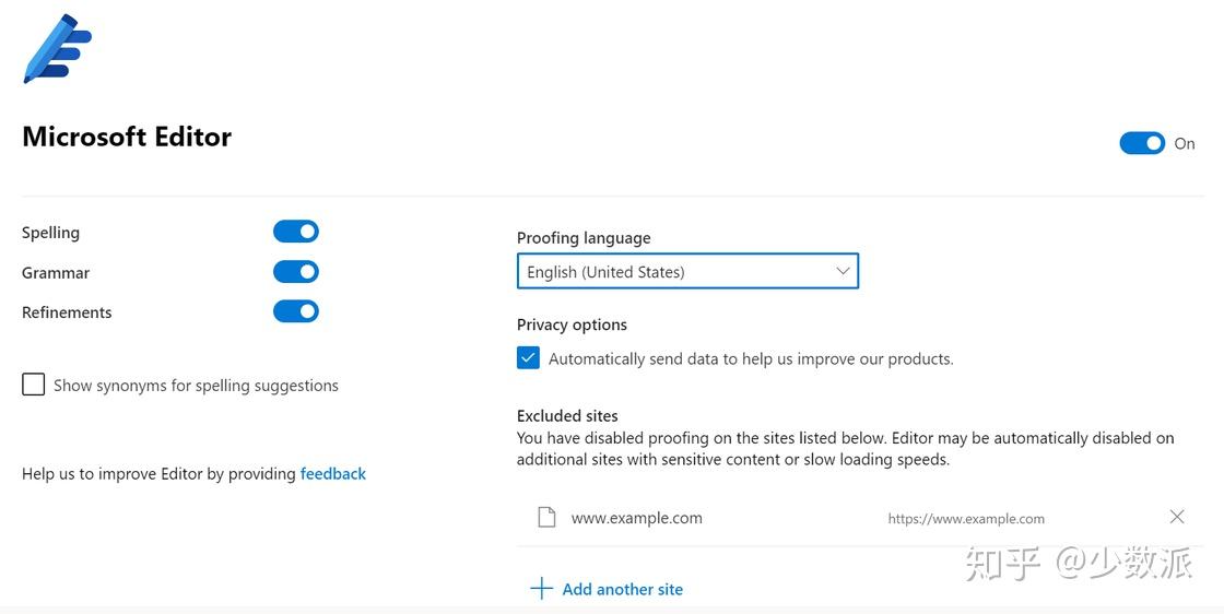 微软在今年三月底上线了一个全新的服务,名叫 Microsoft Editor。这是一款由人工智能驱动的写作助手,将帮助你自信地撰写 20 多种语言。Microsoft Editor 不仅能提供基础的语法建议和拼写检测,如果你订购了 Office 365(不论个人还是家庭版),你还能享受到诸如清晰度,简洁性,一致性,词汇建议等高级语法润色功能。Microsoft Editor 不仅内嵌到 Office 全家桶中(Word, Outlook 等),也提供了浏览器插件供你在多平台使用。