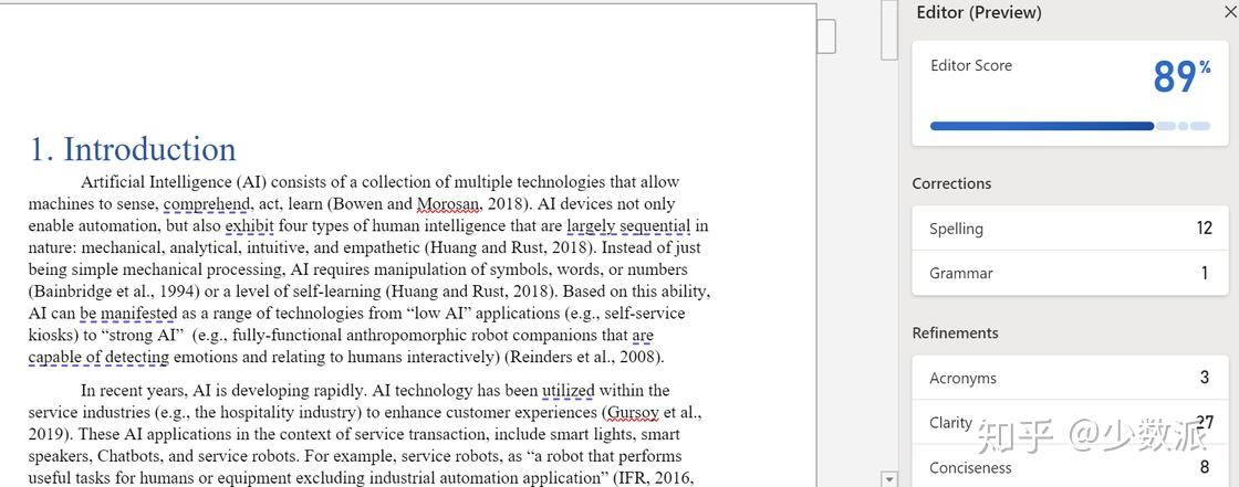 以学术论文作为例子,我对比了自己一篇论文的前两个部分 (引言和理论),总计 1616 字。两款工具都给文章打了一个总分,Grammarly 给出了 98/100 的分数,而 Microsoft Editor 的分数为 89/100。
