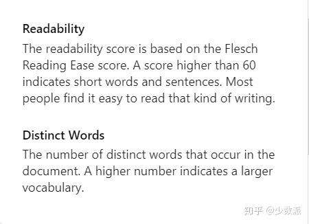 Microsoft Editor 和 Grammarly 都有一个直观的数据统计功能。Microsoft Editor 在校对框中就可以直接显示该文档的可读性 (readability, 数值高于 60 都是短句,清晰易懂)、独立单词数 (distinct words, 数值越高表明需要更高的词汇量)、阅读预计时间 (To read)、以及朗读预计时间 (To speak)。并且,点击总分,可以直观地查看需要完善哪些内容可以提高分数。