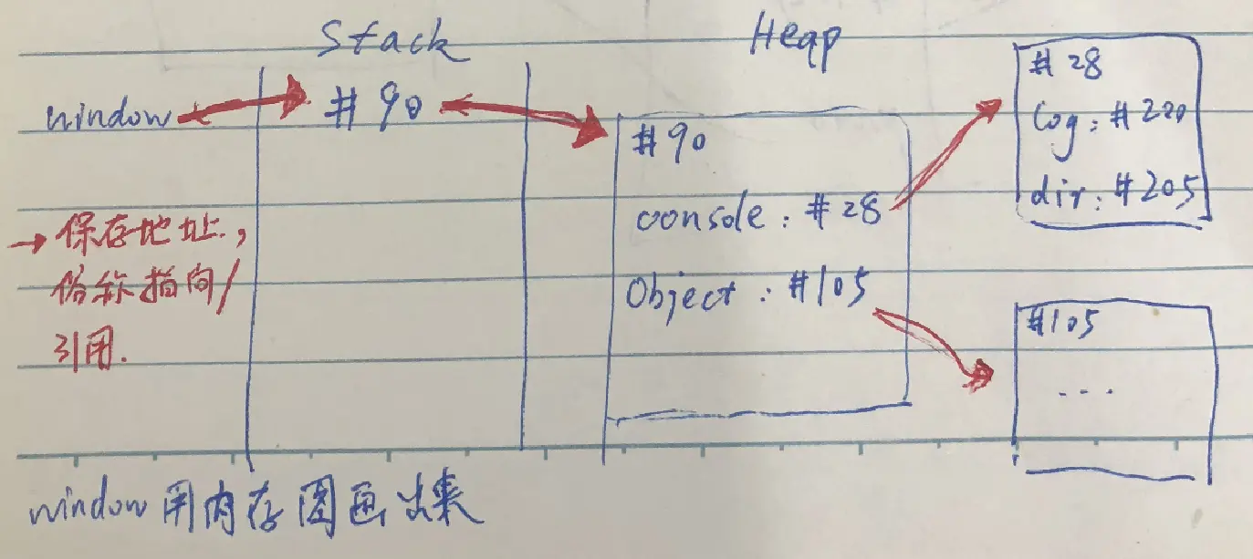 window变量是一个容器,存放window对象的地址,window对象是heap里的数据