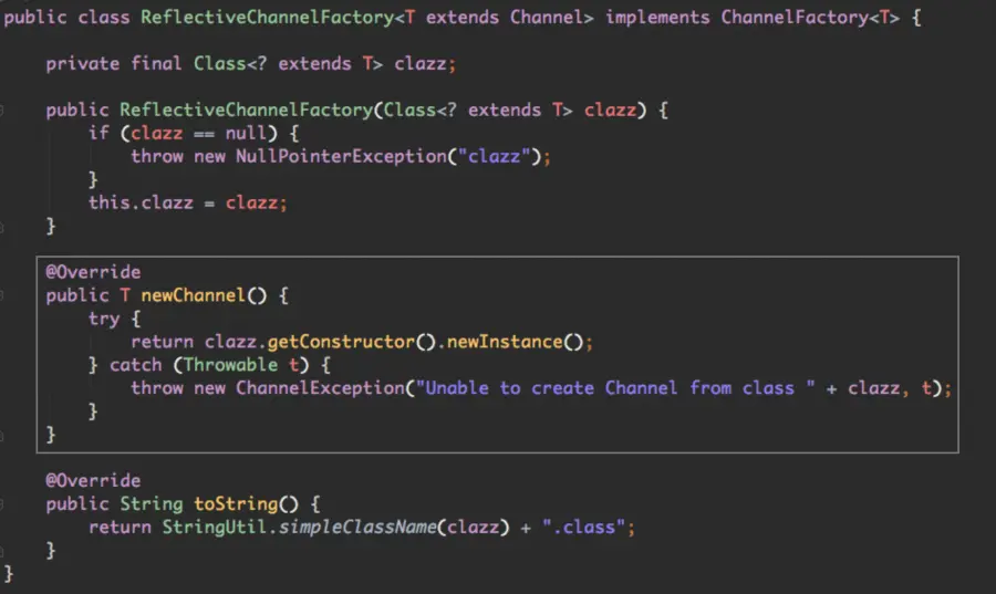 newChannel() 方法是 ChannelFactory 接口中的唯一方法,工厂模式大家都很熟悉。我们可以看到,