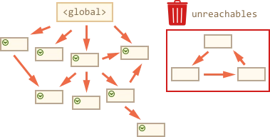 基本的垃圾回收算法称为“标记-清除”,定期执行以下“垃圾回收”步骤: