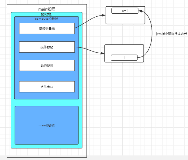 当线程执行computer方法底层执行第一行指令码incost_1的时候,它就会让jvm类执行引擎在jvm对应方法所属的栈对应的栈帧里面那个操作数栈里面放一个常量1