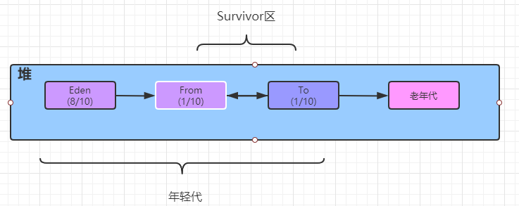 等到Eden区放满,回收一些垃圾,还有一些对象是有引用的就是存活的对象,存活的对象jvm会把它挪到survivor区,等到survivor区的From区放满之后也会触发minor gc,这时候会把From区和Eden区无效的对象都清理一遍,把From区有效的对象挪到To区