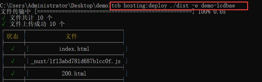 tcb hosting:deploy ./dist -e demo-1cdbae