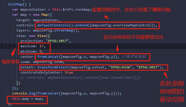 首先,获取地图的标签this.$refs.rootmap,new Map()对象生成的就是地图本身,基本内容下图已标注,最后是将地图变量绑定到data中。