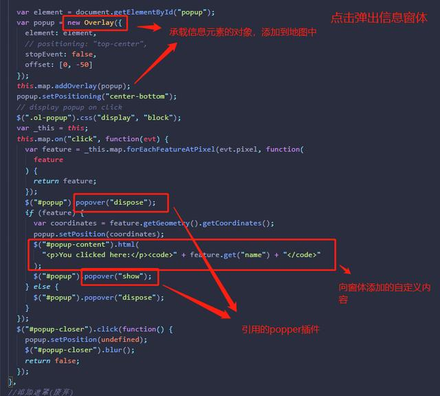然后是点击点标记进行弹窗展示信息的方法,new overlay()是openlayers的信息窗体的方法,需要将内容集成到此方法中,然后this.map.addOverlayer()是将窗体承载到地图上。