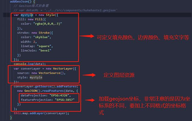 首先,将定义的填充颜色,边界颜色、和填充文字单独提取到new style()对象中,然后定义资源图层,将样式对象添加进去,引入new GeoJSON()对象,用于加载geojson数据,需要注意的是因为坐标系的不同,需要设置转换格式,不然不显示遮罩区域也不会报错