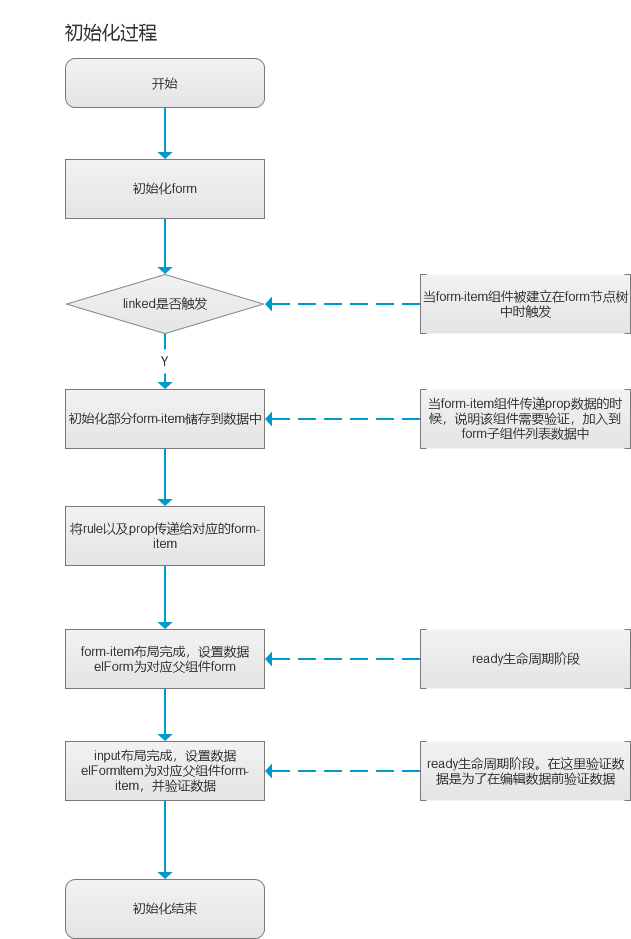在 form-item 初始化的过程中,存储父组件 form,因为验证的时候是会需要通知 form 来验证是否已全部验证通过,来进行一些必要的操作(比如未全部通过验证,操作按钮置灰等)