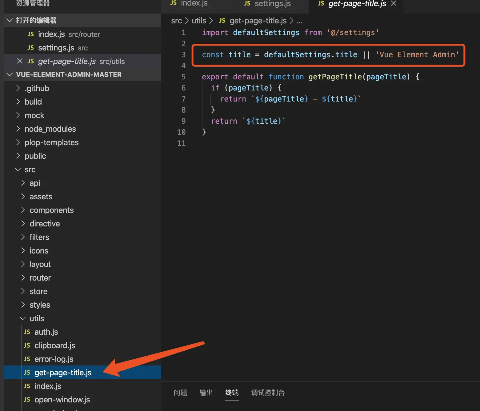1)找一下项目中哪里依赖了title,找到utils/get-page-title.js