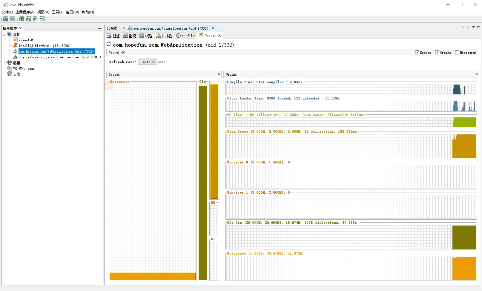 之后等待程序运行后,打开这个jvisualvm工具就可以查看到JVM内存运行时的状况