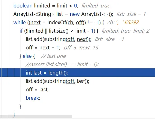 split() 方法可以传递 2 个参数,第一个为分隔符,第二个为拆分的字符串个数。查看该方法源码的话,你就可以看到以下内容: