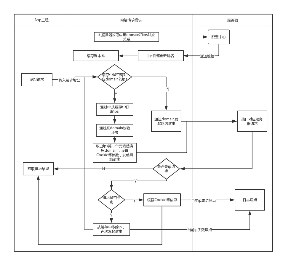在 App 启动时或者合适的时间向服务器请求配置表,这里的请求可以用固定 IP 替代域名,免去域名解析的过程。这里要注意的点是,如果使用 IP 请求,需要在 header 指定 host 字段。