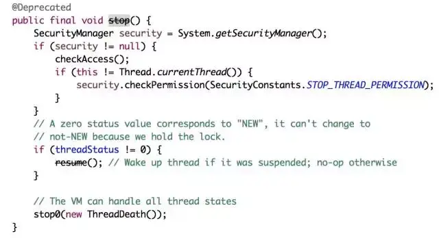 我们的系统肯定有些线程为了保证业务需要是要常驻后台的,一般它们不会自己终止,需要我们通过手动来终止它们。我们知道启动一个线程是start方法,自然有一个对应的终止线程的stop方法,通过stop方法可以很快速、方便地终止一个线程,我们来看看stop的源代码。