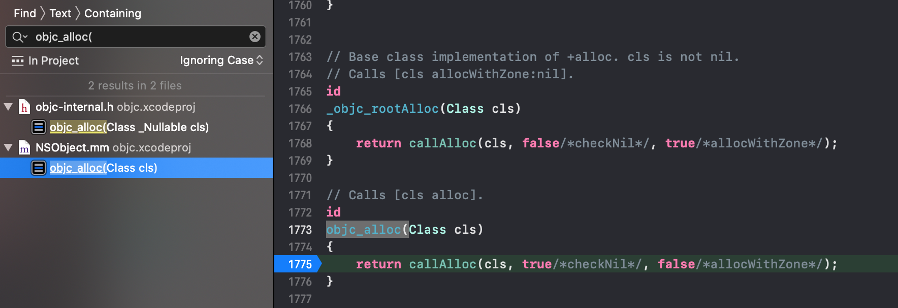 通过断点的形式得到的流程是: alloc->_objc_rootAlloc->callAlloc(cls,false,true)->allocWithZone->_objc_rootAllocWithZone->class_createInstance->_class_createInstanceFromZone