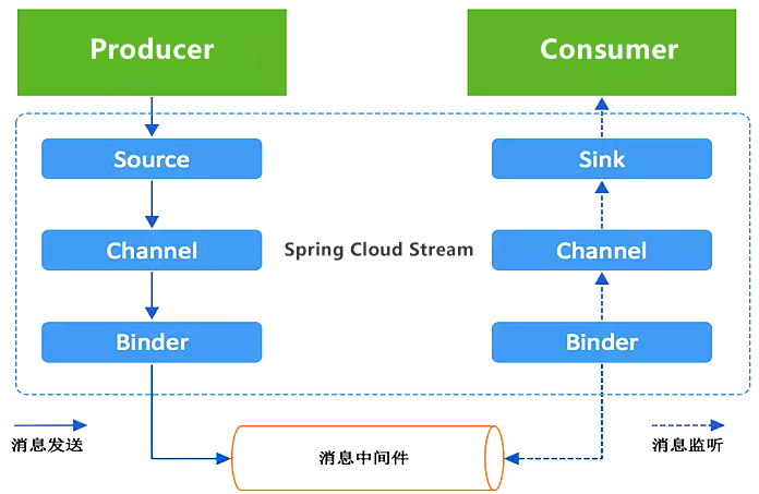 Source:当需要发送消息时,我们就需要通过Source.java,它会把我们所要发送的消息进行序列化(默认转换成 JSON 格式字符串),然后将这些数据发送到 Channel 中;Sink:当我们需要监听消息时就需要通过Sink.java,它负责从消息通道中获取消息,并将消息反序列化成消息对象,然后交给具体的消息监听处理;Channel:通常我们向消息中间件发送消息或者监听消息时需要指定主题(Topic)和消息队列名称,一旦我们需要变更主题的时候就需要修改消息发送或消息监听的代码。通过Channel对象,我们的业务代码只需要对应Channel就可以了,具体这个 Channel 对应的是哪个主题,可以在配置文件中来指定,这样当主题变更的时候我们就不用对代码做任何修改,从而实现了与具体消息中间件的解耦;Binder:通过不同的Binder可以实现与不同的消息中间件整合,Binder提供统一的消息收发接口,从而使得我们可以根据实际需要部署不同的消息中间件,或者根据实际生产中所部署的消息中间件来调整我们的配置。
