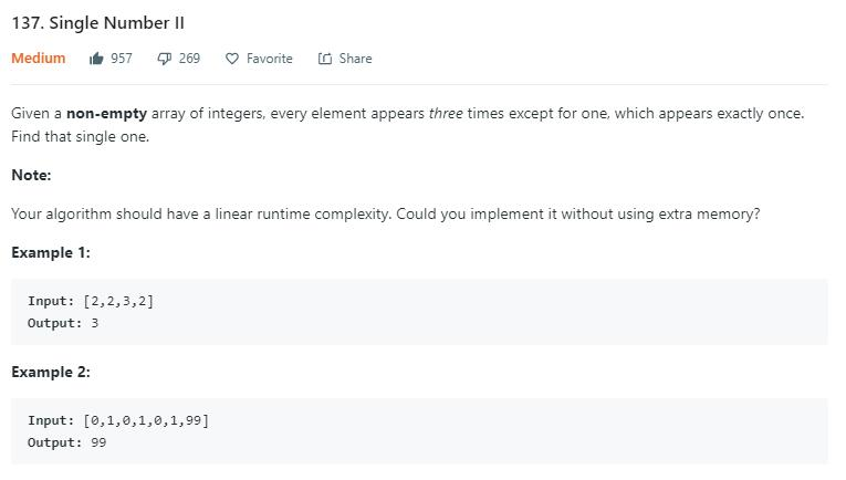 136 题 的升级版,这个题的话意思是,每个数字都出现了 3 次,只有一个数字出现了 1 次,找出这个数字。同样要求时间复杂度为 O(n),空间复杂度为 O(1)。