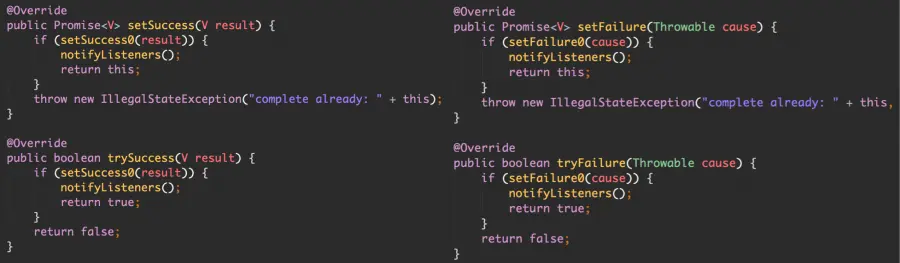 }我觉得只要明白一点,Promise 实例内部是一个任务,任务的执行往往是异步的,通常是一个线程池来处理任务。Promise 提供的 setSuccess(V result) 或 setFailure(Throwable t) 将来会被某个执行任务的线程在执行完成以后调用,同时那个线程在调用 setSuccess(result) 或 setFailure(t) 后会回调 listeners 的回调函数(当然,回调的具体内容不一定要由执行任务的线程自己来执行,它可以创建新的线程来执行,也可以将回调任务提交到某个线程池来执行)。而且,一旦 setSuccess(...) 或 setFailure(...) 后,那些 await() 或 sync() 的线程就会从等待中返回。