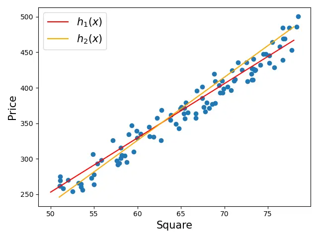 以最开始的房价预测为例,现在假设你求解得到了图中所示的两个模型与
