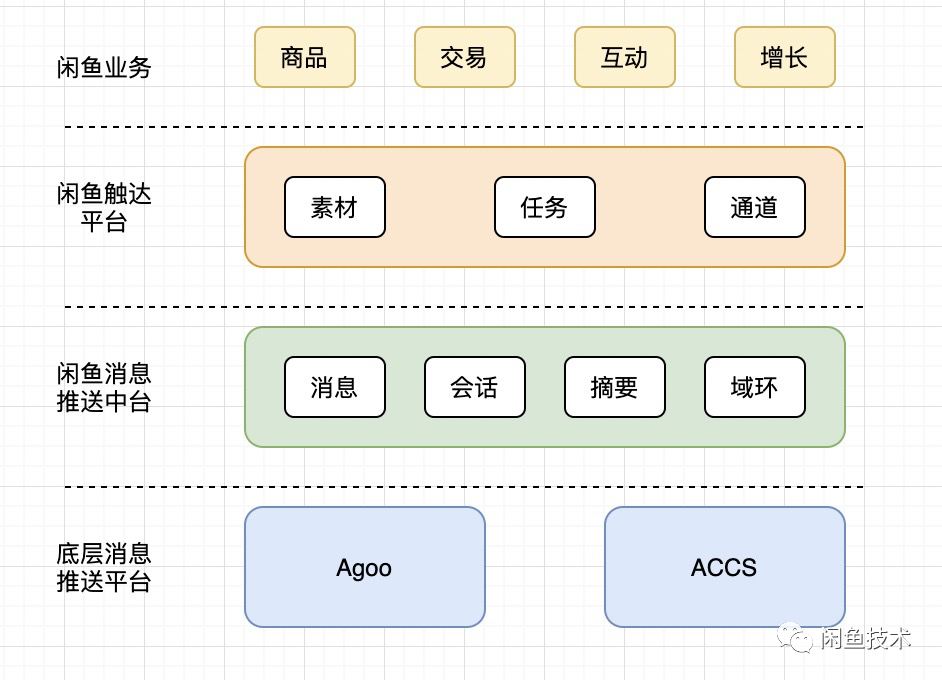 消息推送是移动互联网的基础设施,阿里内部也有很多消息推送平台,从系统分层上分为两种,第一种是与业务无关的建设消息推送底层能力的基础平台,负责对接操作系统的系统消息通道和各手机厂商的厂商消息通道,屏蔽各种通道差异,对外提供统一消息推送规范和能力;第二种是基于底层消息推送能力,与业务特点相结合后抽象设计的消息推送中台,闲鱼消息推送系统就属于第二种。