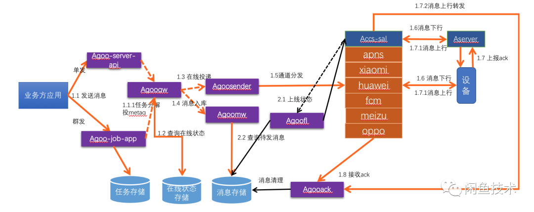当闲鱼给用户发Push时,调用Agoo服务端SDK,入参为用户信息和推送内容。Agoo服务端会根据用户ID查询用户最近绑定设备,根据设备是否在线选择通过ACCS通道还是厂商通道推送消息。