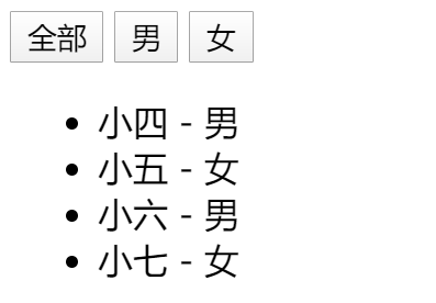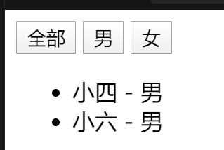 页面中有三个按钮,点击‘全部’,显示全部用户;点击‘男’,只显示男性用户。。。